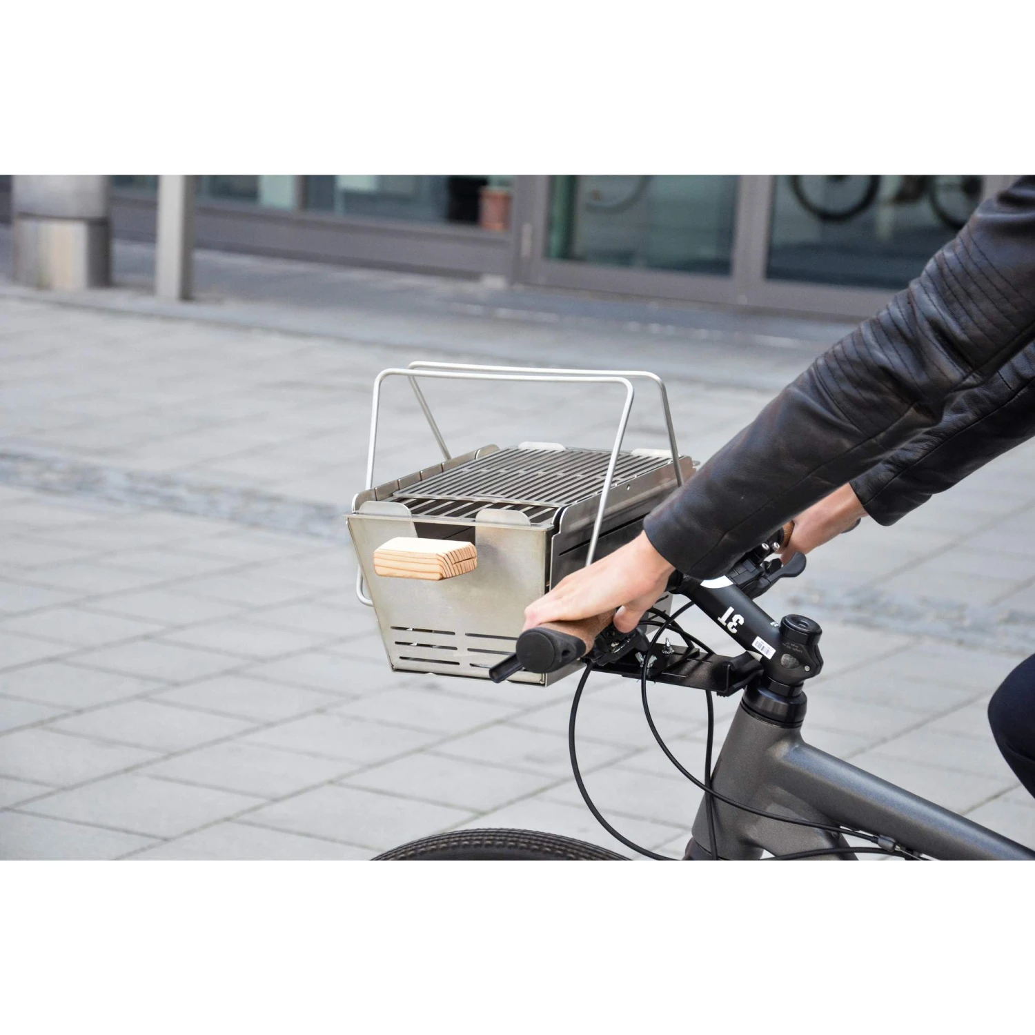 Um den Transport deines Knister Grills auf dem Rad zu erleichtern, kannst du ihn mit dieser Halterung am Lenker montieren, um ihn so zum Grillfest zu transportieren.