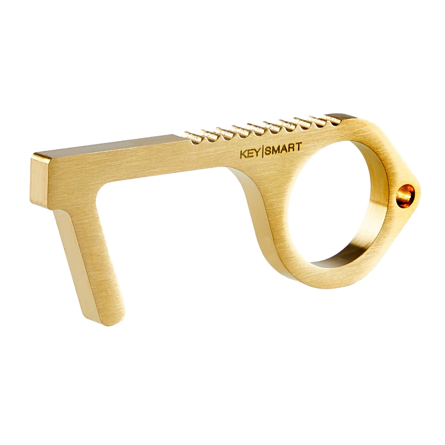Durch die Befestigung am Schlüsselbund ist der Cleankey immer in griffweite und bereit für den Einsatz. Das Material besteht aus Messing mit einer antimikrobieller Kupferlegierung. Um beim Bedienen ein besseres Handling zu gewährleisten, ist die Oberseite strukturiert.