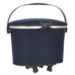 Aufhängung für Gepäckträger mit einem Rohrdurchmesser von 8 bis 16 mm. Die beiden oberen Haken lassen sich werkzeugfrei auf der aus einem Stück gefertigten Schiene verschieben und durch Anheben des Tragegriffs öffnen. Der untere Arretierungshaken ist ebenfalls auf einer halbelliptischen Schiene individuell anpassbar und werkzeugfrei in 15-Grad-Schritten drehbar. Ein Scheuerschutz im unteren Bereich der Tasche und an der Auflagefläche des Gepäckträgers beugt Abrieb vor.